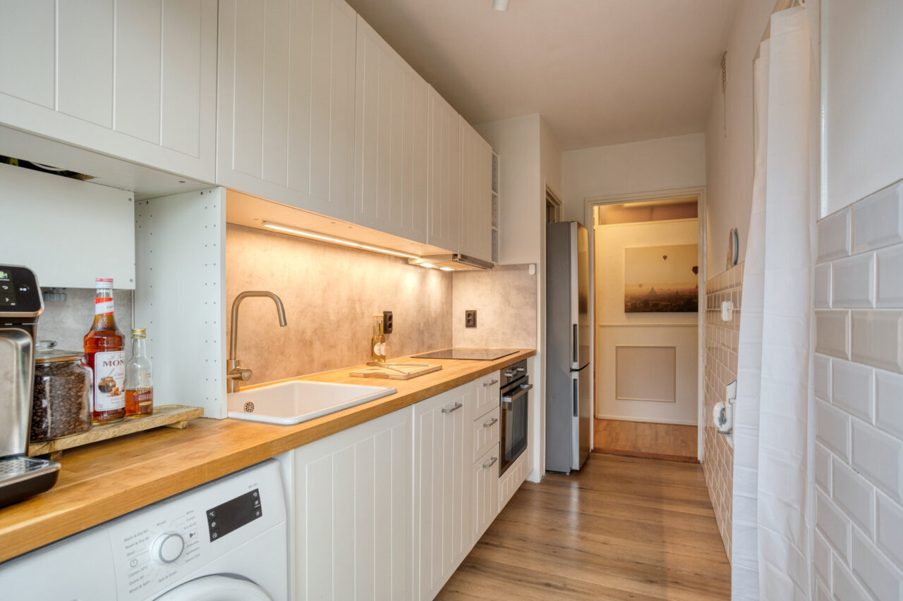 Upon entering, you arrive in the central hallway. The living room is an immediate and pleasant surprise, wonderfully light and with access to the south facing balcony, where you can enjoy the sun and the open green view. The bedroom is spacious and comfortable. The kitchen has its own north facing balcony, perfect for a cup of coffee in the morning sun.