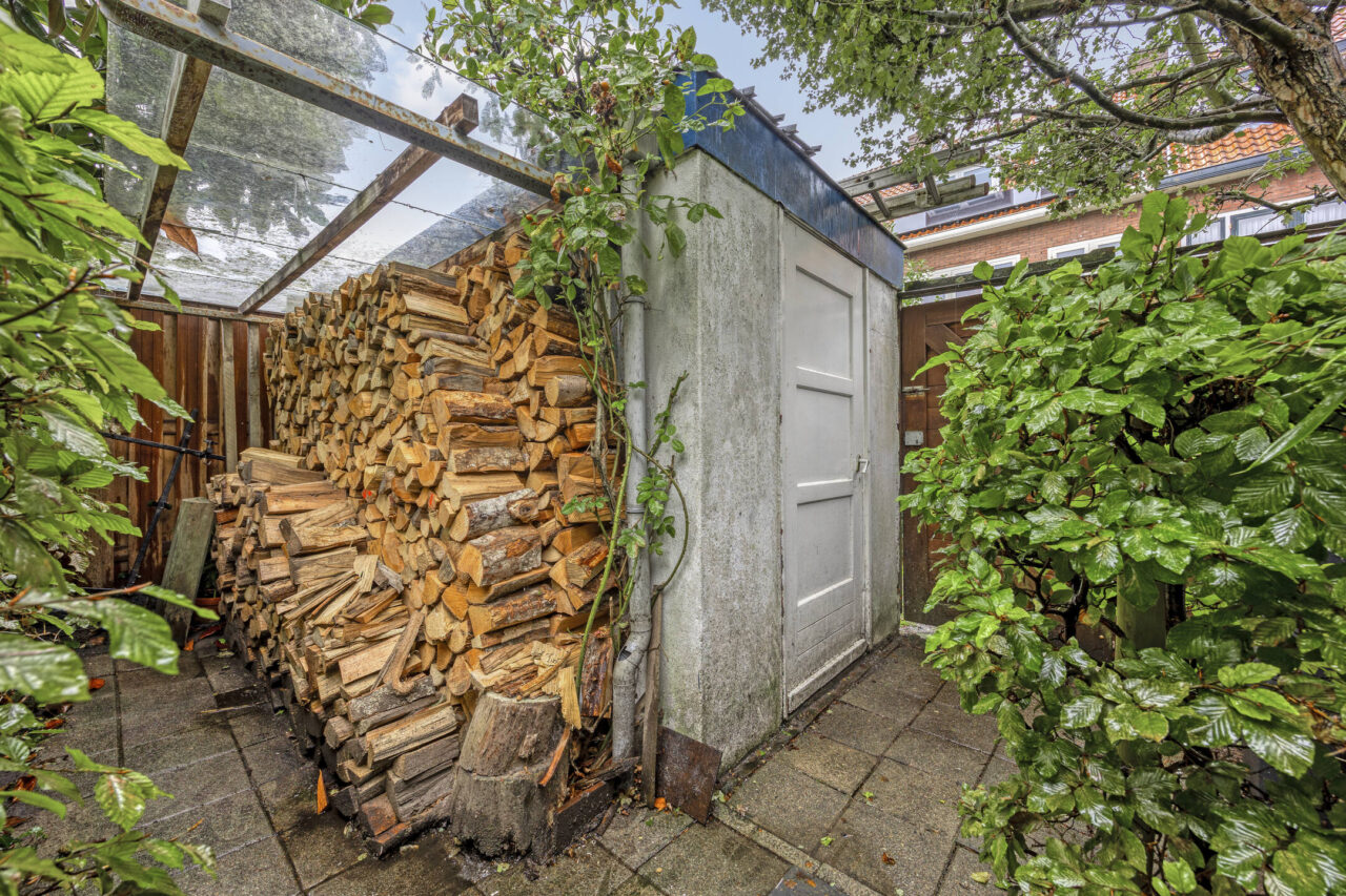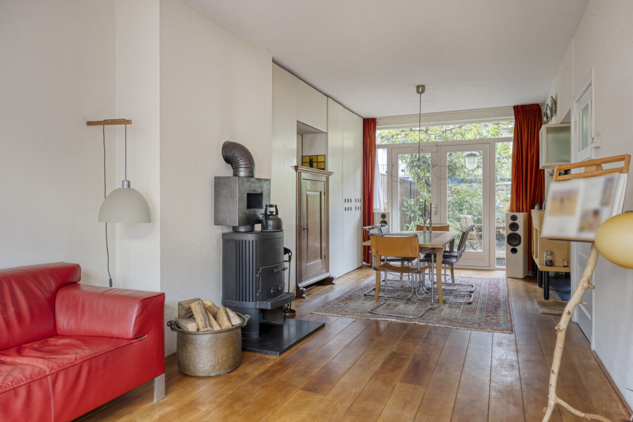 voortuin. Entree met originele voordeur, vestibule met granito vloer en tochtdeuren naar de hal met trapkast en hangend toilet. Lichte woon- en eetkamer met massief Robinia-houten vloer, erker voorzien van glas-in-lood en een sfeervolle houtkachel. Aan de achterzijde een open keuken met inbouwapparatuur. Via de nieuwe openslaande deuren, die volledig 180 graden open kunnen, stap je de zonnige tuin op het westen in. De tuin heeft een handige indeling met druivenstaken, stenen berging en een afsluitbaar achterom.
