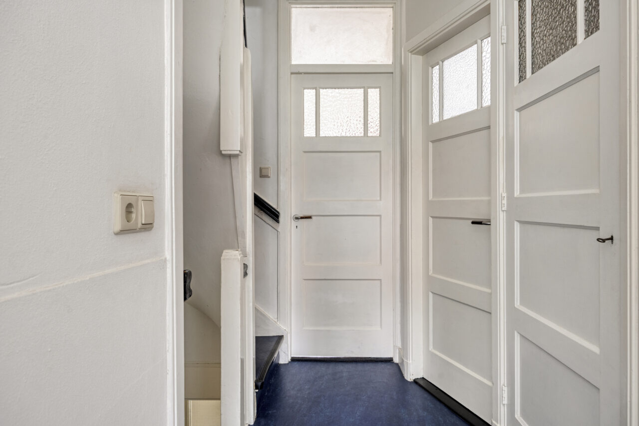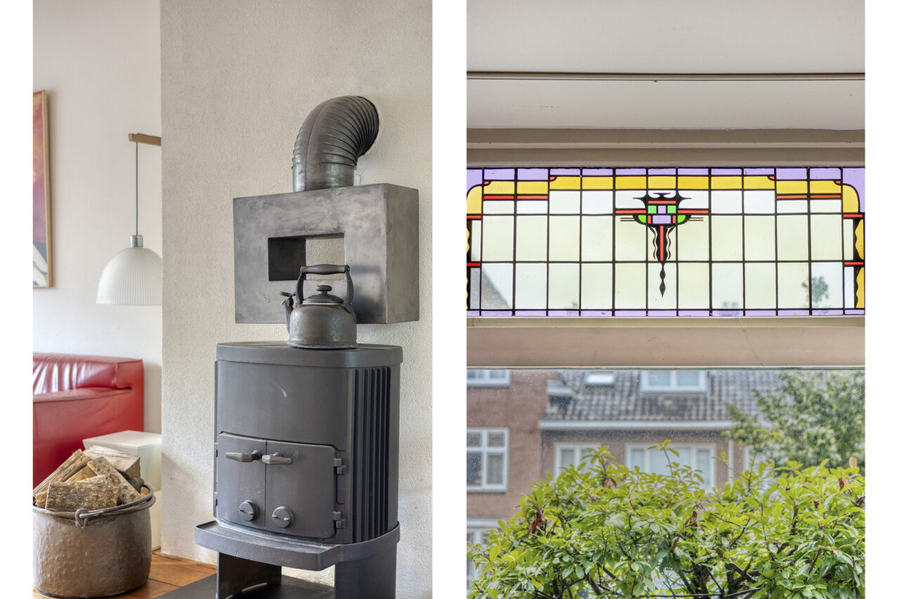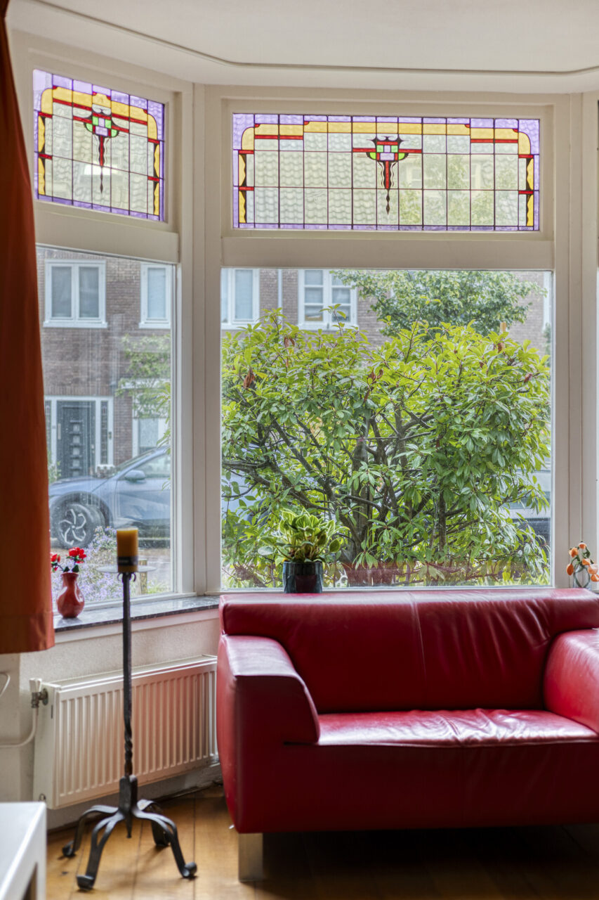 This charming 1930s house at Jan Haringstraat 28 immediately feels welcoming as soon as you step inside. Original features such as the vestibule with beautiful terrazzo floor, panelled doors, bay window with stained glass and the unique letterbox in the façade have been preserved, giving the home an honest and distinctive character. The solid front door with its elegant curve and tall side windows is also a real eye-catcher. These elements are effortlessly combined with modern conveniences.