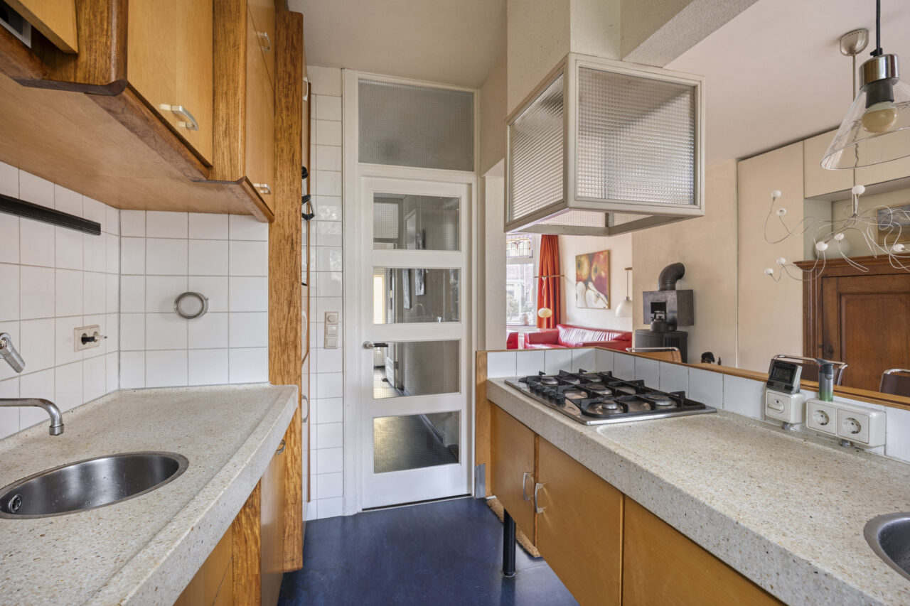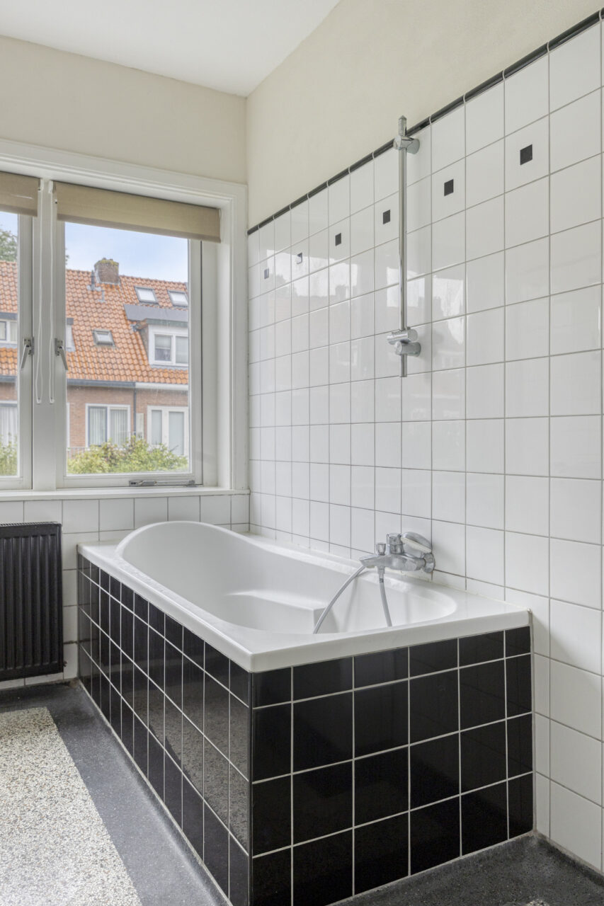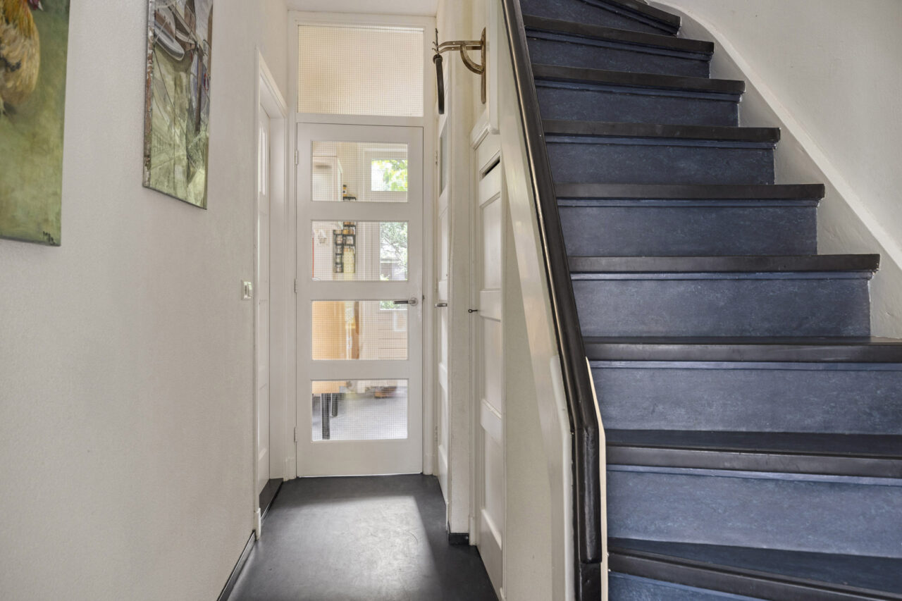This charming 1930s house at Jan Haringstraat 28 immediately feels welcoming as soon as you step inside. Original features such as the vestibule with beautiful terrazzo floor, panelled doors, bay window with stained glass and the unique letterbox in the façade have been preserved, giving the home an honest and distinctive character. The solid front door with its elegant curve and tall side windows is also a real eye-catcher. These elements are effortlessly combined with modern conveniences.