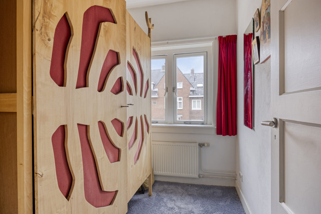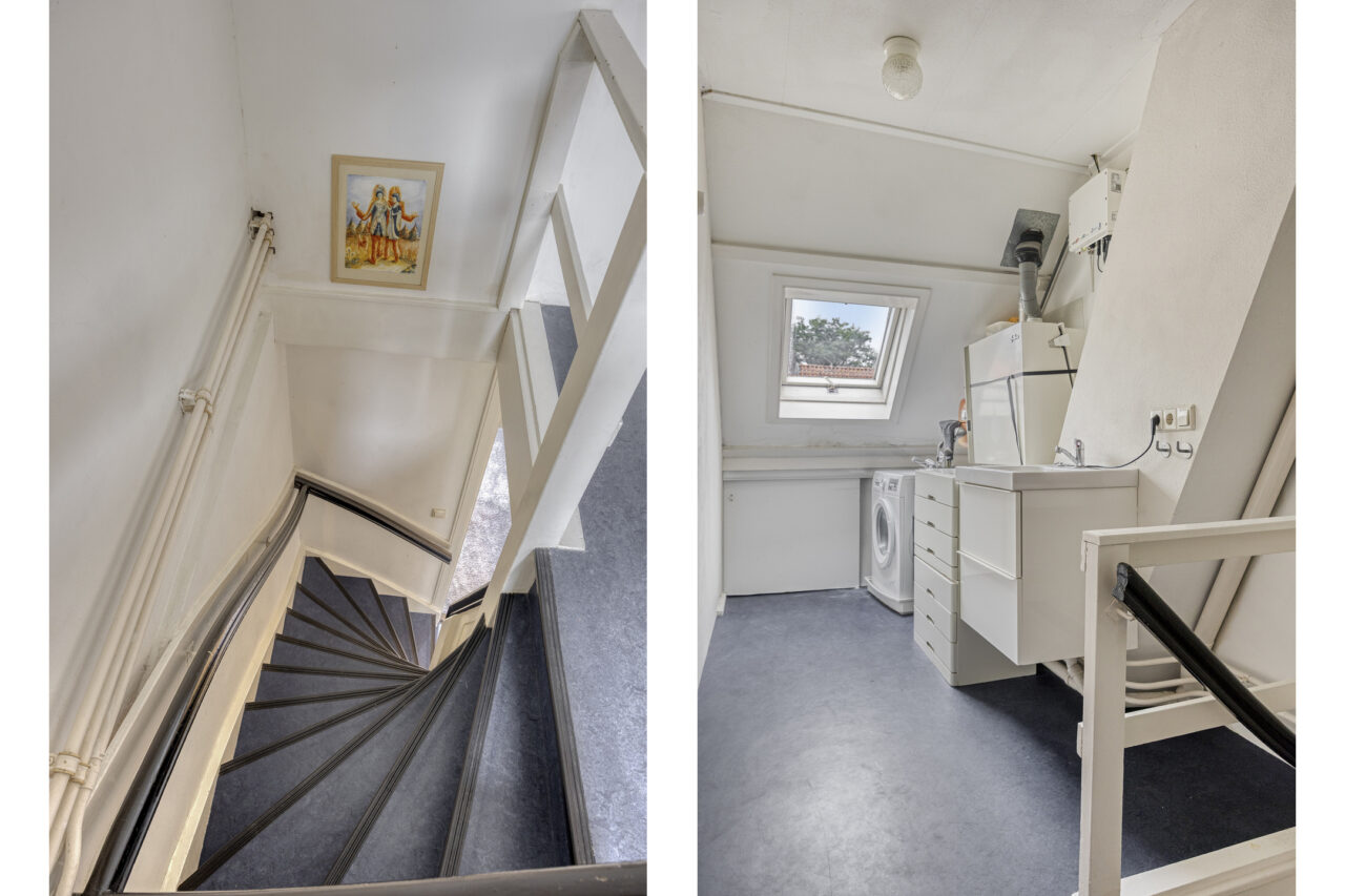 overloop met dakraam, aansluitingen voor wasmachine en droger en cv-opstelling. Royale slaapkamer over de volle breedte van de woning met originele dakkapel aan de voorzijde en een speelse serre-achtige dakkapel aan de achterzijde. Op deze verdieping zorgt de speciaal ontworpen dakkapel met dubbele dakramen voor een spectaculaire lichtinval. Dit doordachte element versterkt het ruimtelijke gevoel en maakt van deze verdieping een unieke, lichte leefruimte.