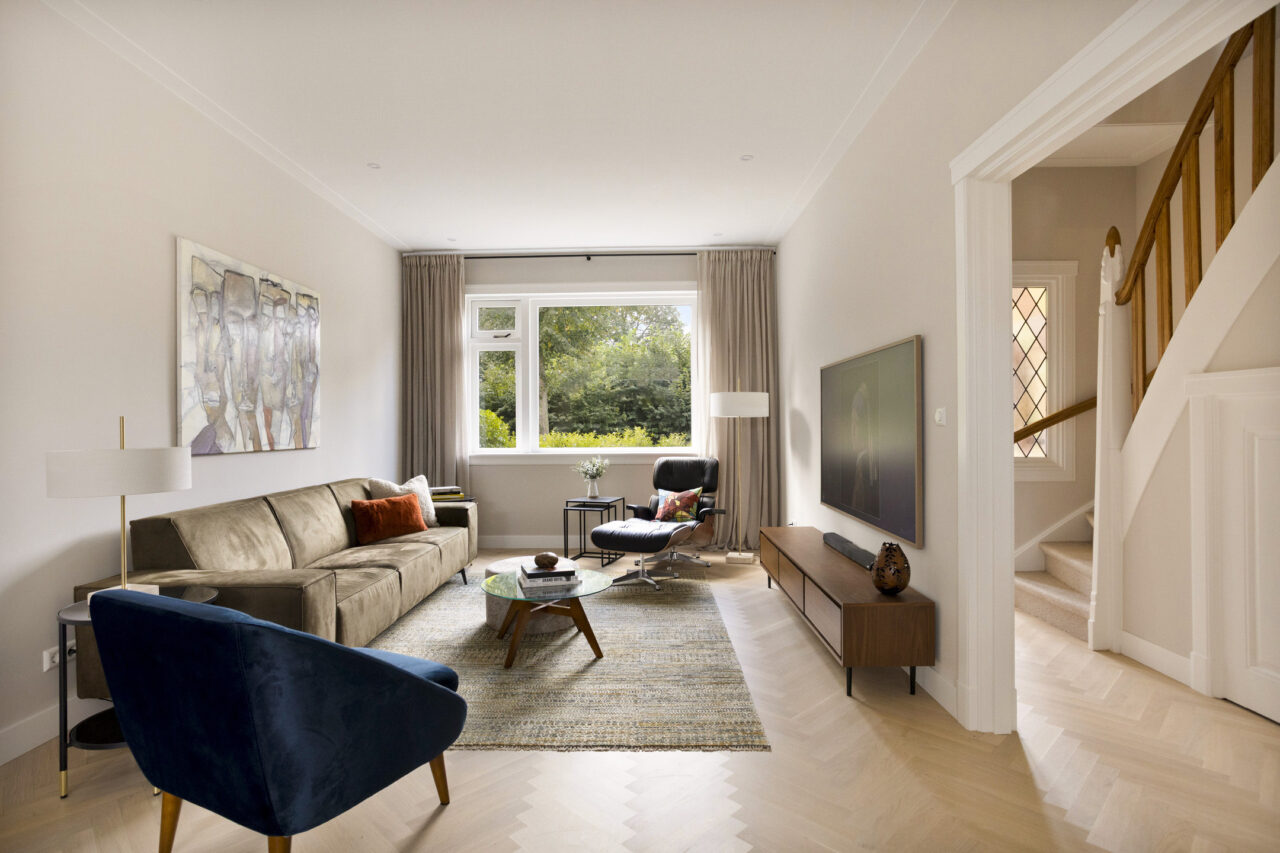 Door de hele woning is gekozen voor een rustige en elegante kleurstelling. Frisse wittinten, warme beigetonen en natuurlijke houtaccenten vullen elkaar harmonieus aan en benadrukken de authentieke details. Een mooi voorbeeld hiervan is de trap met balustrade, waar hout, wit en beige samen zorgen voor een tijdloze en verfijnde uitstraling.