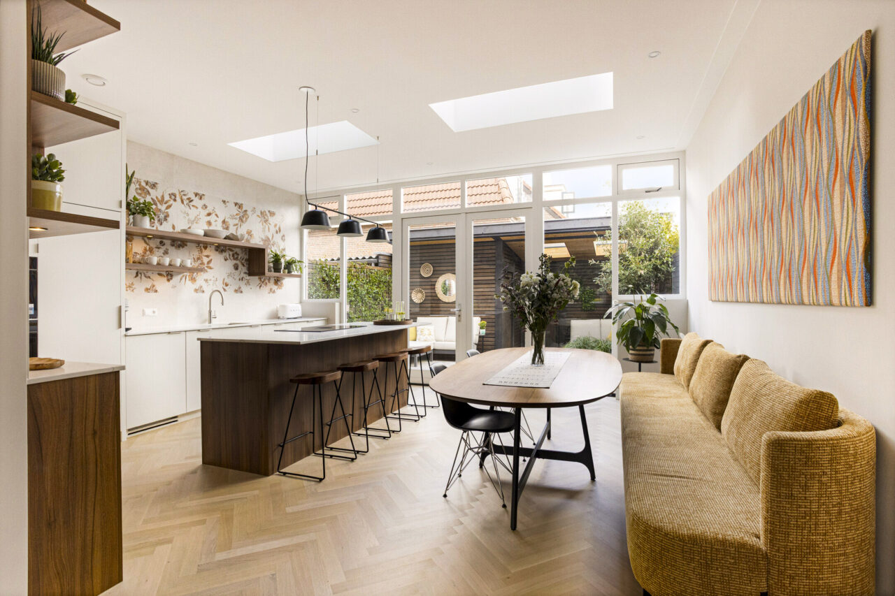 De lichte woonkamer en open leefkeuken vormen samen een warme en uitnodigende leefruimte. De maatwerkkeuken is volledig ingericht met Siemens apparatuur, waaronder een oven, combi oven, koelkast, vriezer en een Bora inductiekookplaat met geïntegreerde afzuiging. Het kookeiland maakt de ruimte niet alleen praktisch maar ook een sociale ontmoetingsplek. Daarnaast is er een Quooker met CUBE filter aanwezig, waarmee je direct kunt genieten van koud, warm, kokend, bruisend en gefilterd water.