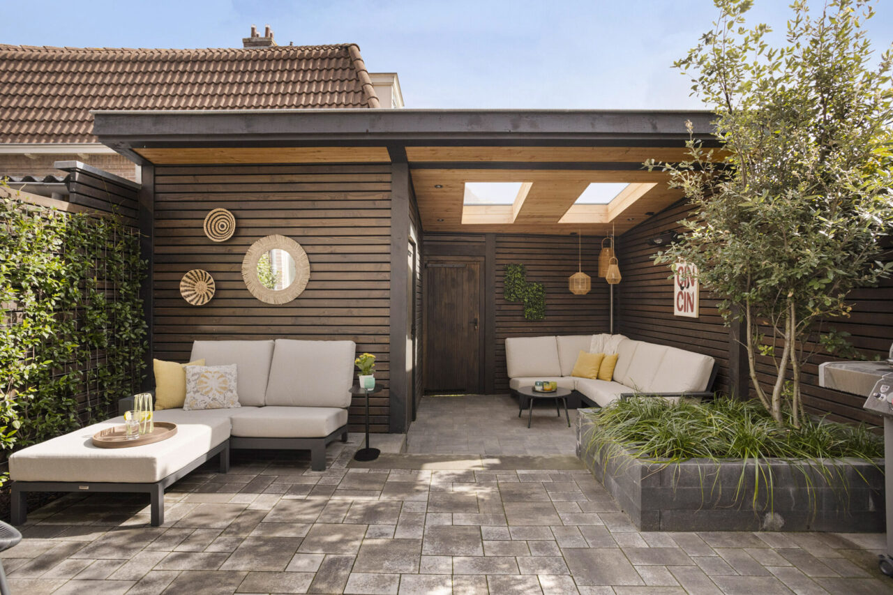 - Achtertuin met overkapping, berging, bekabeling voor tuinverlichting, achterom, terrasverwarmer en inbouwspots