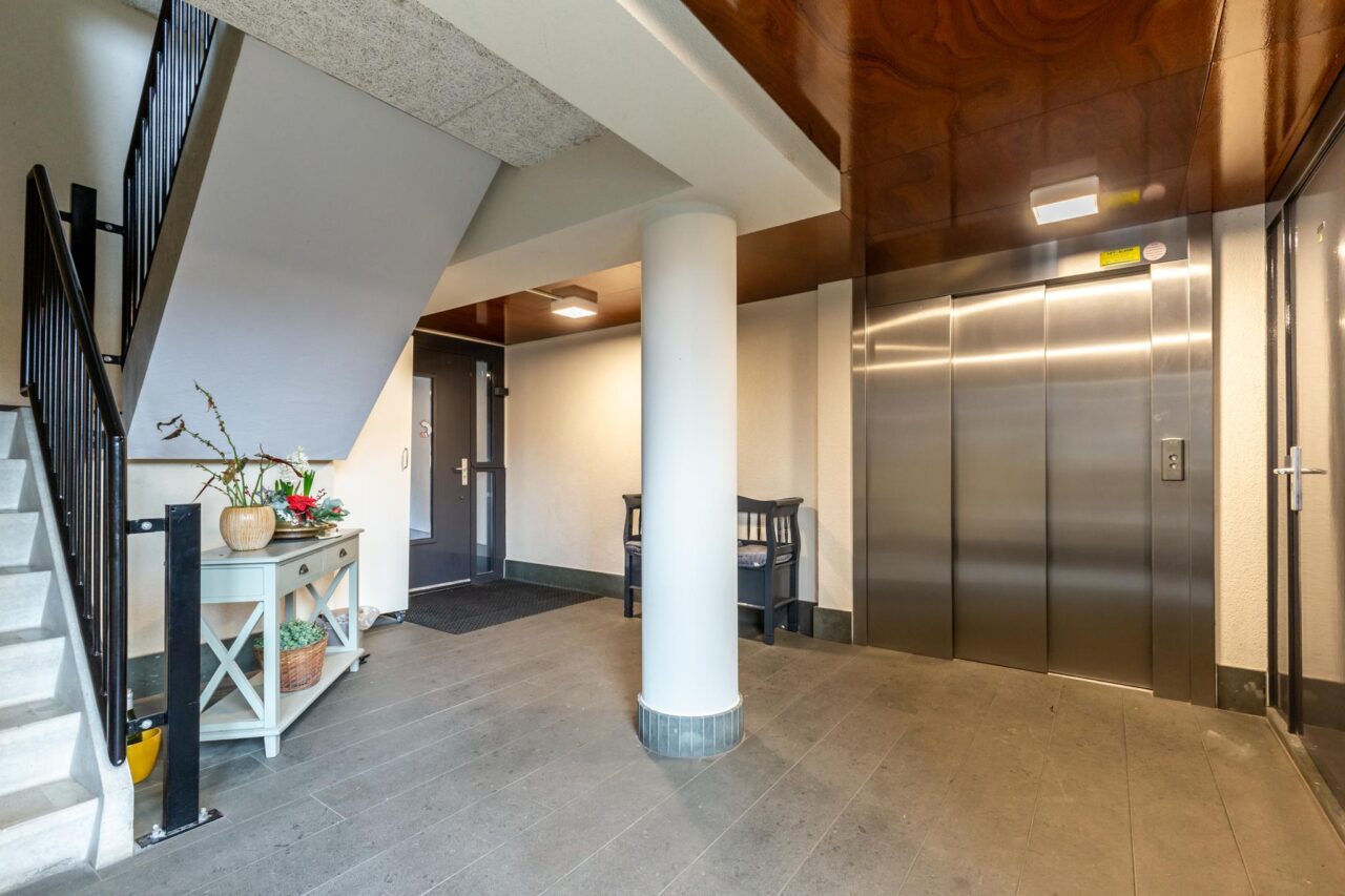 Central entrance with mailboxes, intercom, and elevator. Access to the communal courtyard.