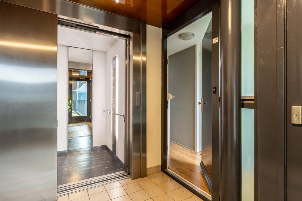 Centrale entree met brievenbussen, bellentableau en lift. Toegang tot gemeenschappelijke binnentuin.