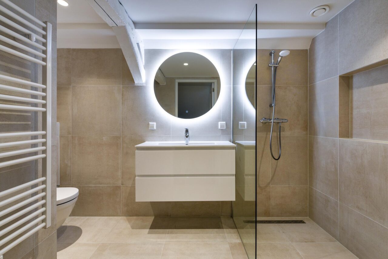 Op de 2e verdieping zijn een overloop, wasruimte, 2 slaapkamers en een 2e badkamer met toilet, douche en toilet. De badkamer is voorzien van modern tegelwerk en het sanitair is van het merk Grohe en Duravit.
