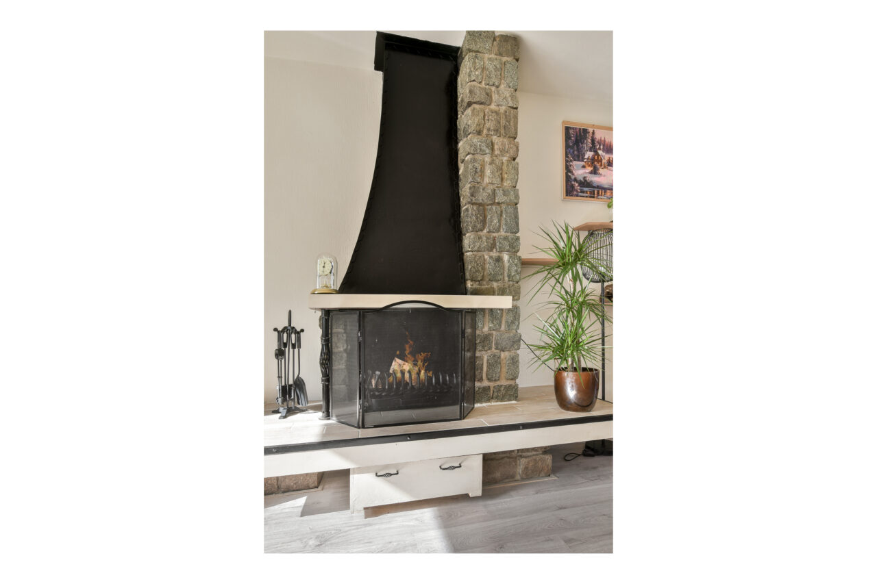 • Grote woonkamer met sfeervolle open haard en openslaande deuren naar de tuin