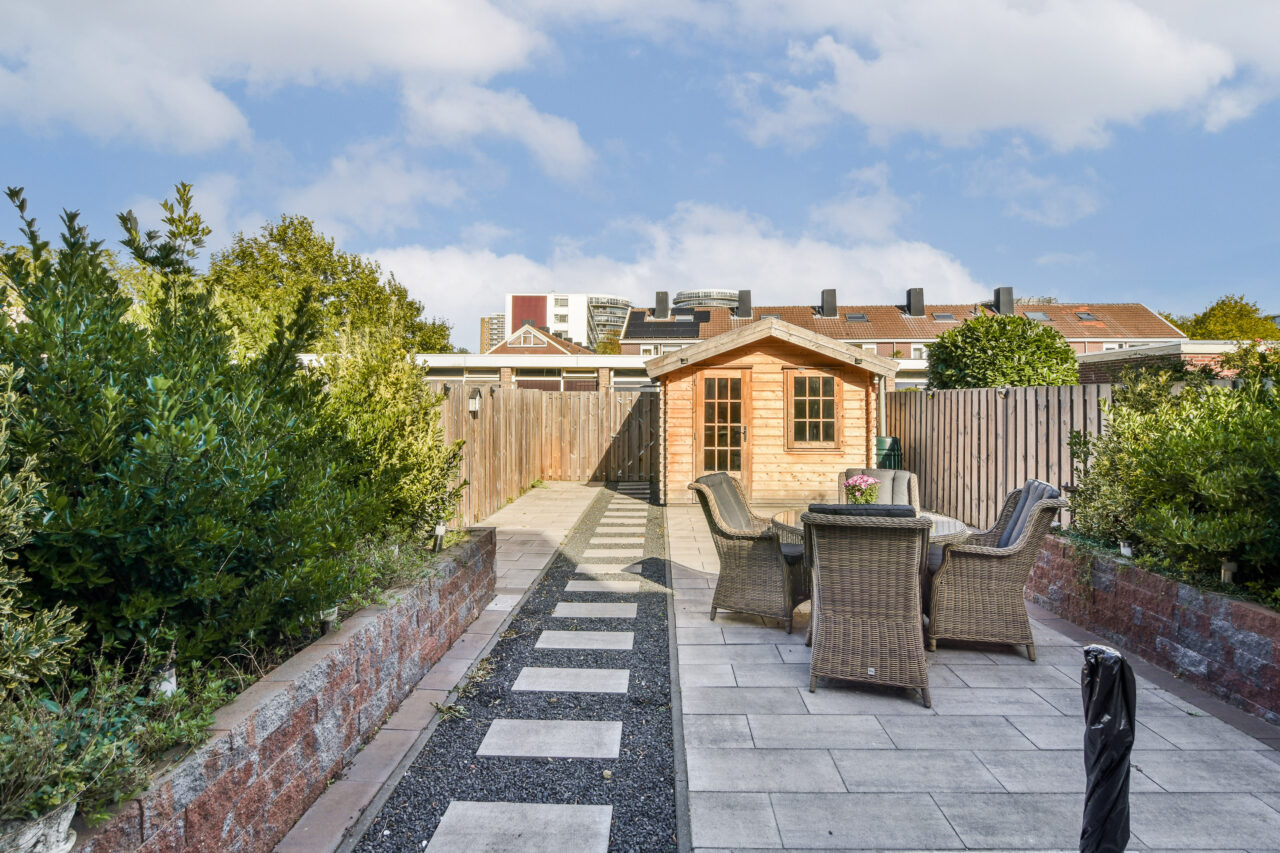 Entrance through a vestibule with meter cupboard. From here, access to the hallway with a practical storage closet and modern toilet. The hallway leads into the bright living and dining room with a cozy fireplace. The living room flows into the open kitchen, which is only four years old and fitted with modern built-in appliances including an induction hob. French doors open directly into the spacious backyard, which also features a charming log cabin and a separate storage shed.