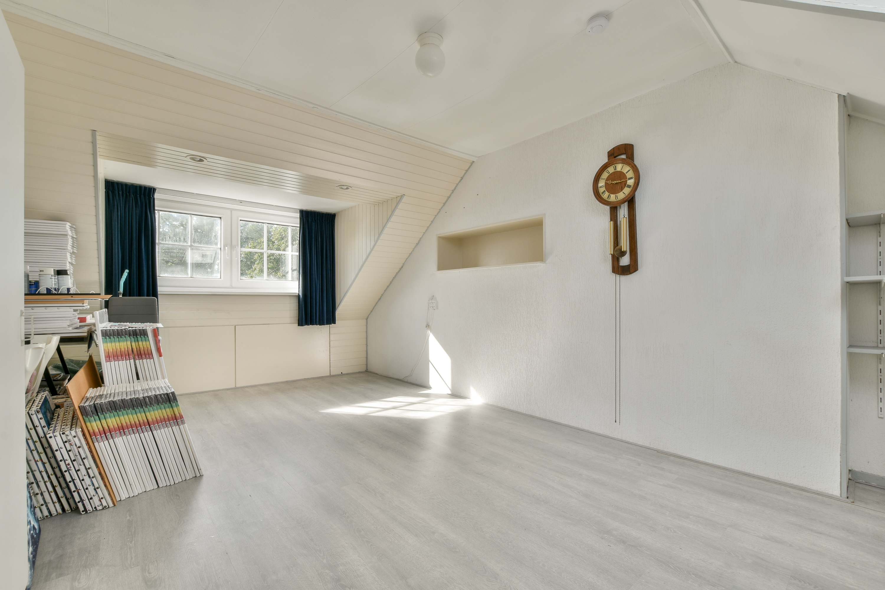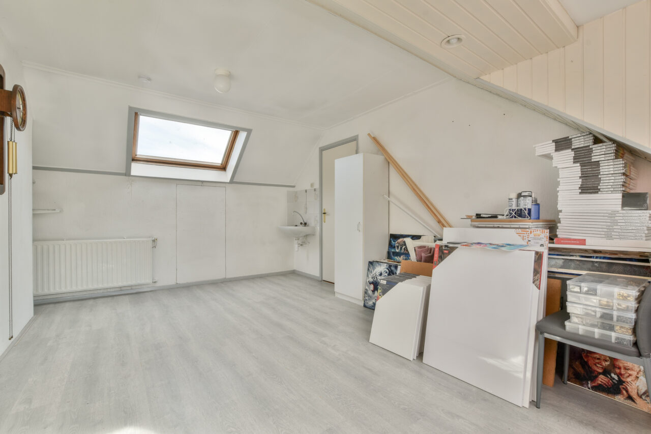Overloop met bergruimte, grote kamer over de volle breedte, voorzien van dakkapel aan de voorzijde en een dakraam aan de achterkant en knieschotten voor extra bergruimte.
